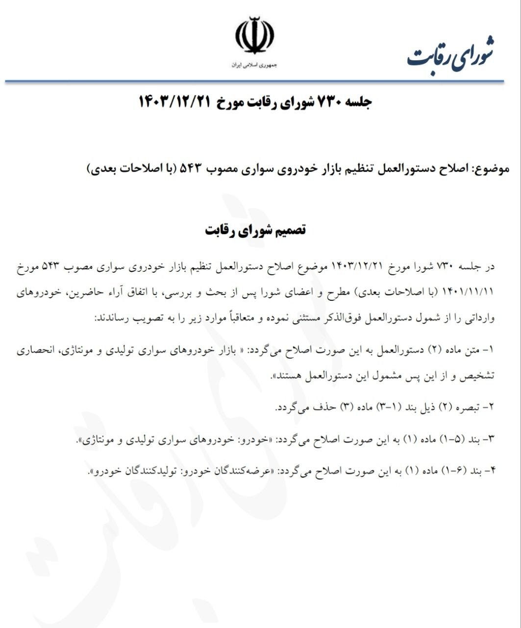 بر این اساس ، دستورالعمل های اصلاح شده شورای رقابت برای تنظیم بازار خودروهای مسافری به شرح زیر است.
