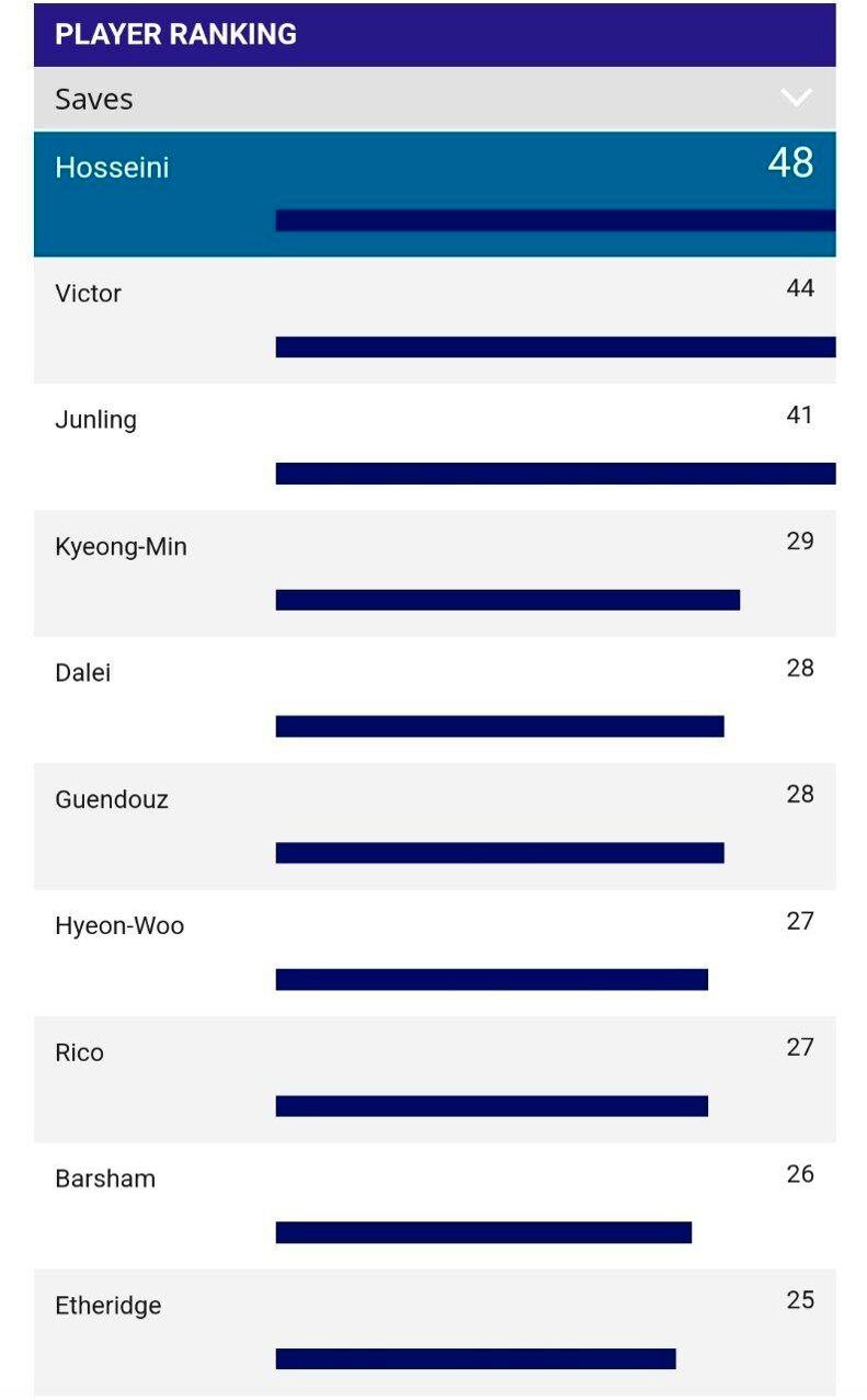 این جدول دروازه بان برتر لیگ حسینی با 4 پس انداز ، دروازه بان پائولو ویکتور قطر با 2 ثانیه است و دروازه بان چینی جان لینگ در رده سوم قرار دارد. جالب اینجاست که شخص چهارم ، دروازه بان گوانگژو چینی کیونگ ما ، که 4 پس انداز دارد و تفاوت زیادی با حسینی دارد.