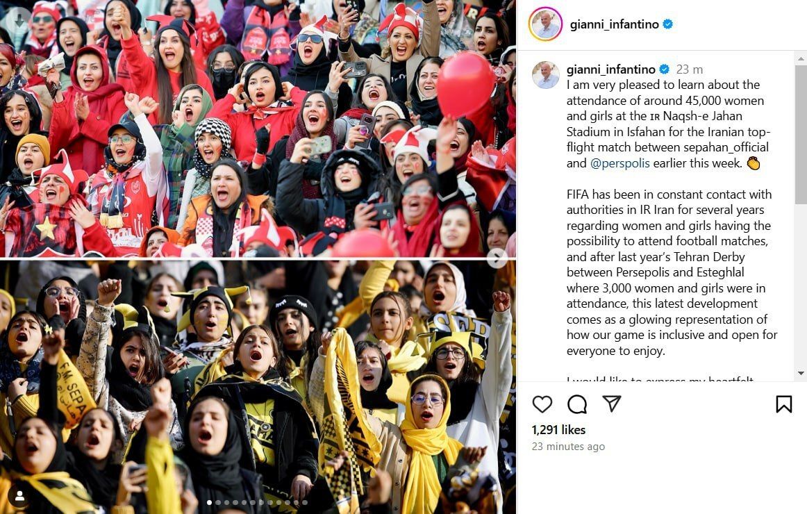 رئیس فیفا در واکنش به حضور هواداران خانم در بازی سپاهان-پرسپولیس: به‌زودی به ایران می‌آیم