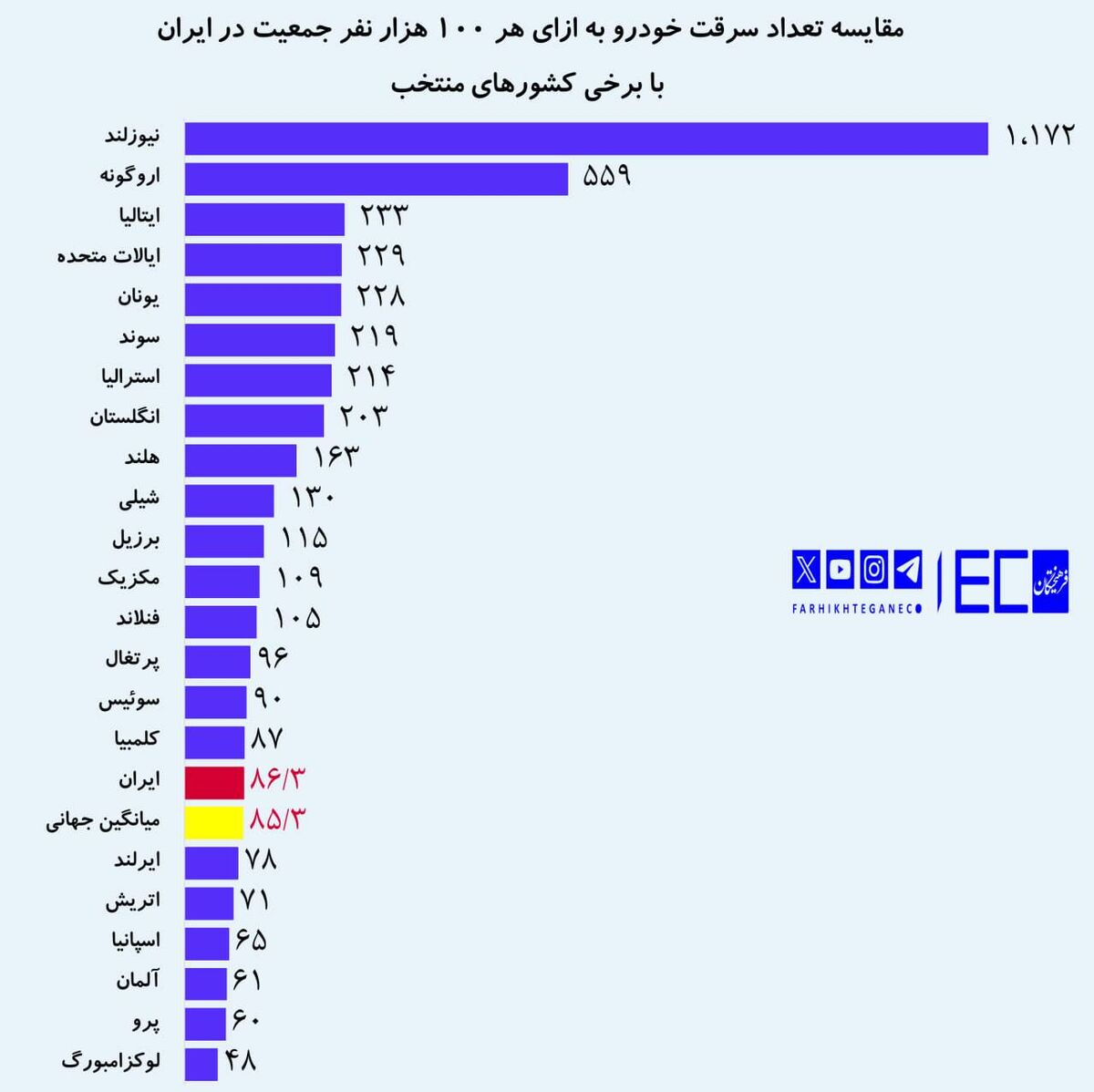 پس از نیوزلند اسامی کشورهایی مانند اروگوئه با 559 سرقت، ایتالیا با 233 سرقت، آمریکا با 229 سرقت، یونان با 228 سرقت، سوئد با 219 سرقت، استرالیا با 214 سرقت، انگلیس با 203 سرقت، هلند با سرقت. 163 سرقت، برزیل با 115 سرقت، فنلاند با 105 سرقت، سوئیس با 90 سرقت، کلمبیا با 87 سرقت که همگی بالاتر از ایران هستند.