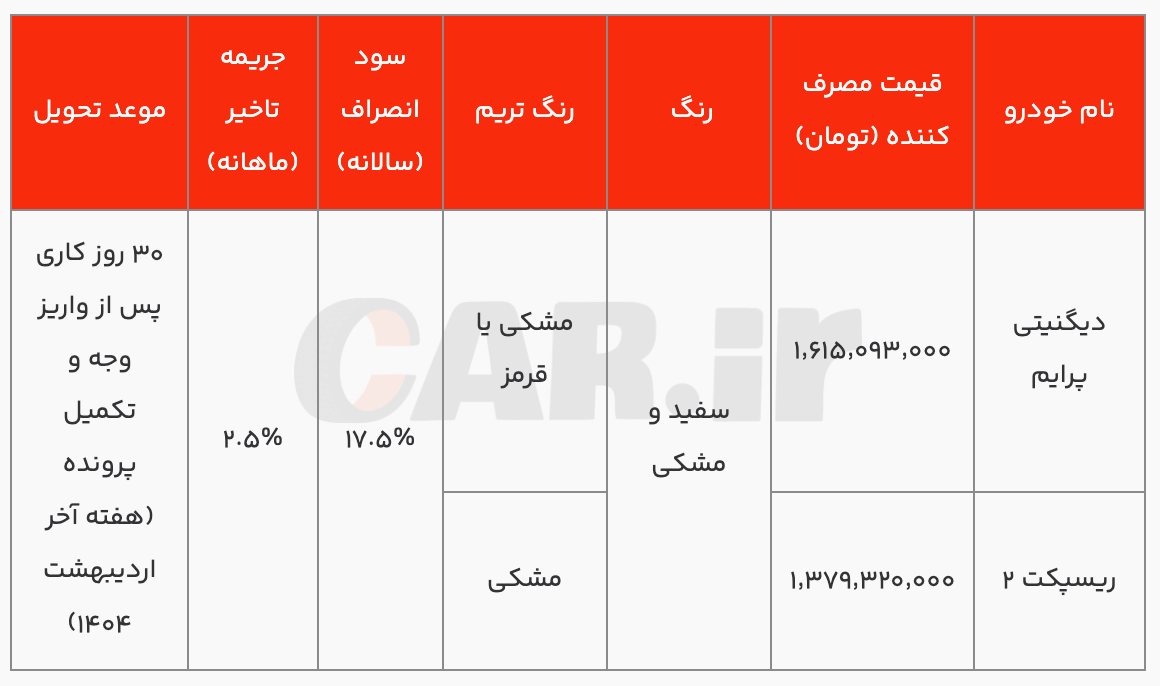 شرایط فروش نقدی ریسپکت ۲ و دیگنیتی پرایم با تحویل ۳۰ روزه