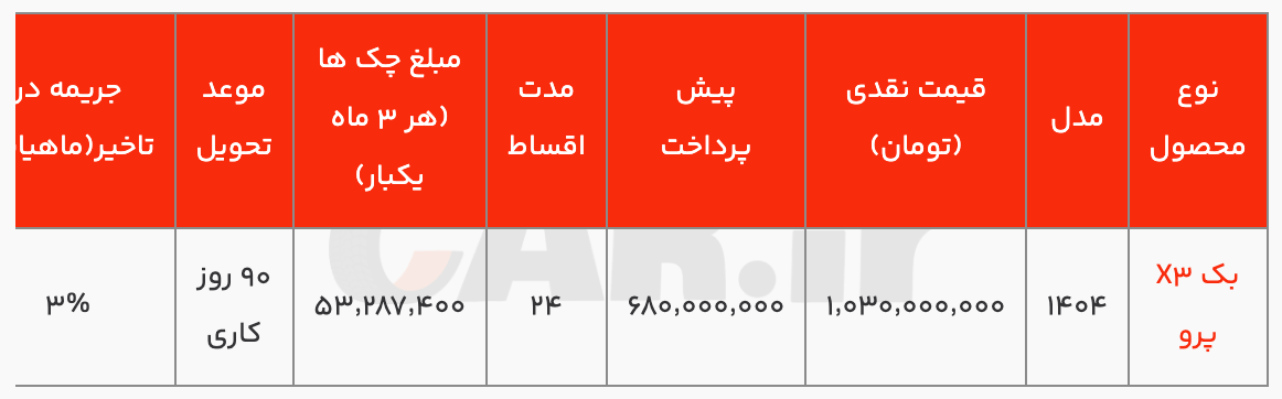 به گزارش بازار، در این طرح خرید Back x3 Pro با قیمت نقدی یک میلیارد و 30 میلیون تومان و امکان خرید اقساطی با پیش پرداخت 680 میلیون تومان و اقساط 24 ماهه نیز فراهم شده است. اقساط هر سه ماه یکبار یک فقره چک محاسبه می شود و تاریخ اولین چک 25 تیر 1404 می باشد و اسناد خودروها تا تسویه نهایی در رهن شرکت باقی می ماند. همچنین مهلت تحویل 90 روز کاری و جریمه تاخیر 3 درصد به صورت ماهانه می باشد.