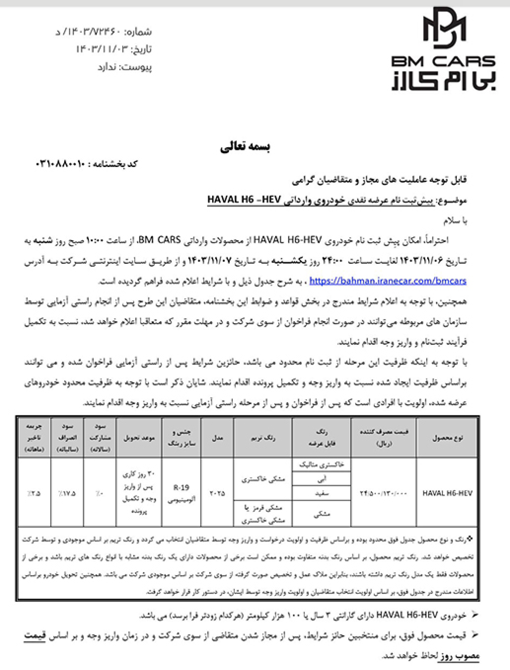 به گزارش بازار، بر اساس بخشنامه شرکت BMW Cars برای خودروی هاوال H6 HEV، پیش ثبت نام این خودرو از روز شنبه آغاز می شود.