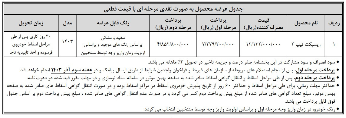 به گزارش بازار، طبق بخشنامه شماره 1403/32822 و 1403/32821 مورخ 28/5/1403 و به موجب تبصره 5 قانون اصلاح ماده 10 قانون سازمان صنعت خودرو در خصوص عرضه خودرو به دارندگان خودروهای دست دوم امکان پیش ثبت نام وجود دارد. نام دستگاهی از محصول Respect Type 2 برای متقاضیانی که دارای خودروهای فرسوده هستند، مفاد ماده 2 آیین نامه اجرایی، ماده 10 قانون سازمان صنعت خودرو و با رعایت و رعایت شرایط مندرج در این آیین نامه، در طرح جایگزینی آنلاین خودروهای فرسوده غیرتاکسی از ساعت 10 روز شنبه 1303/09/03 لغایت 24:00 روز دوشنبه 1403/09/05 و از طریق سایت اینترنتی شرکت بهمن موتور به شرح جدول زیر و با شرایط اعلام شده ارائه شده است.