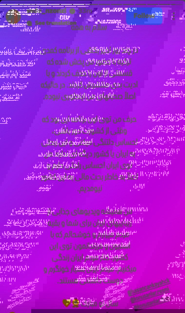 حرف من در این برنامه این بود که وقتی خارج از کشور هستید ، احساس دلتنگی می کنید و هیچ ارتباطی با ایران یا کشور دیگر ندارد. من در ایران احساس راحتی می کنم و برای بحث مالی به این کشور نیامده ایم.