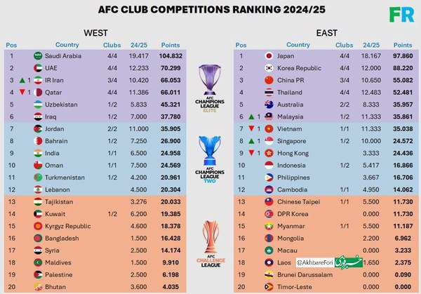 بر این اساس ، با استقلال هشتم لیگ نخبگان و تراکتور به چهارم نهایی لیگ قهرمانان آسیا ، امتیاز فوتبال ایران به 6000 افزایش یافت تا به پنجم در آسیا برسد.