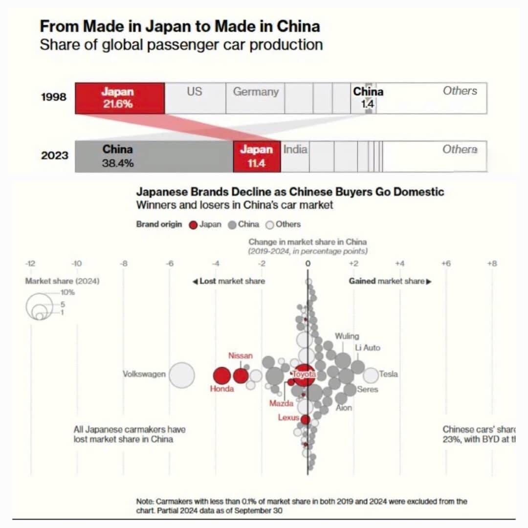 نه تنها نفوذ خارجی ها در بازار چین دشوار شده است، بلکه شرکت های چینی در حال گسترش نفوذ جهانی خود با سرعتی چشمگیر هستند و پتانسیل سرمایه گذاری بلندمدت قابل توجهی را ارائه می دهند. برندهای داخلی چین حدود یک پنجم تولید جهانی خودرو و 60 درصد تولید خودروهای الکتریکی را تشکیل می دهند، اما تنها 10 درصد از ارزش بازار خودروسازان جهانی را تشکیل می دهند. برای شرکت هایی که قادر به نوآوری و رقابت با چینی ها در زمینه فناوری و قیمت هستند، چشم انداز سرمایه گذاری بلندمدت روشن به نظر می رسد. اما برای دیگران، این آغاز فروپاشی اقتصادی آنهاست.