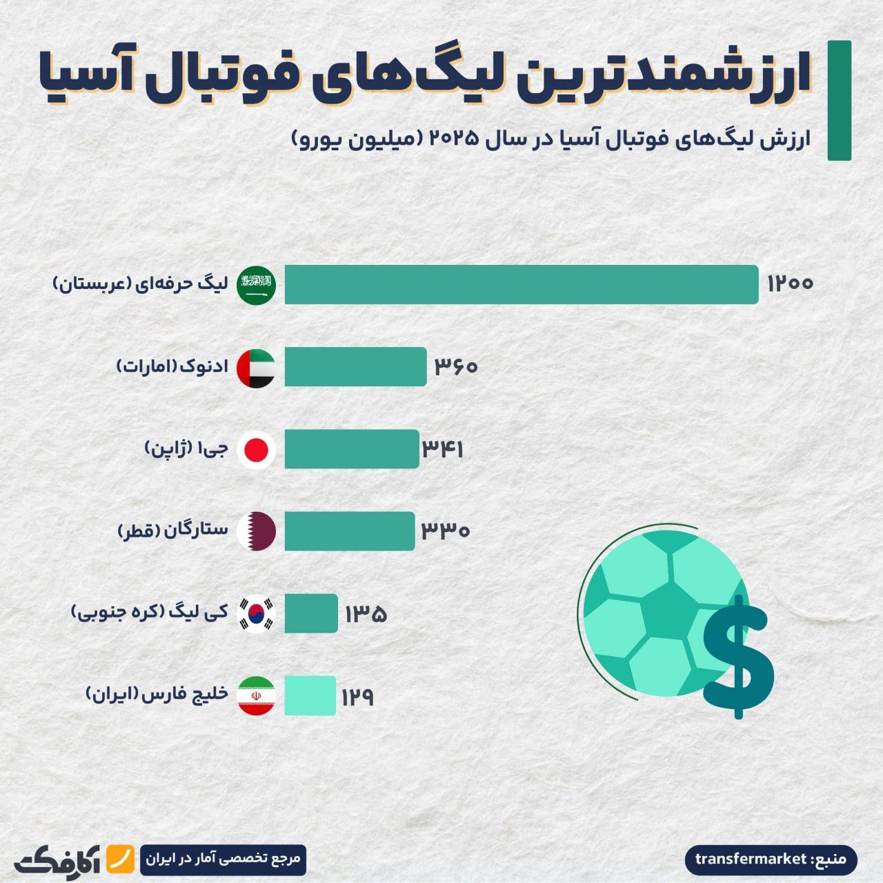 لیگ حرفه ای سعودی از 5 میلیون یورو با سایر لیگ های آسیا فاصله دارد ، در حالی که لیگ ایران ششمین لیگ ارزشمند آسیا با 5 میلیون یورو است.