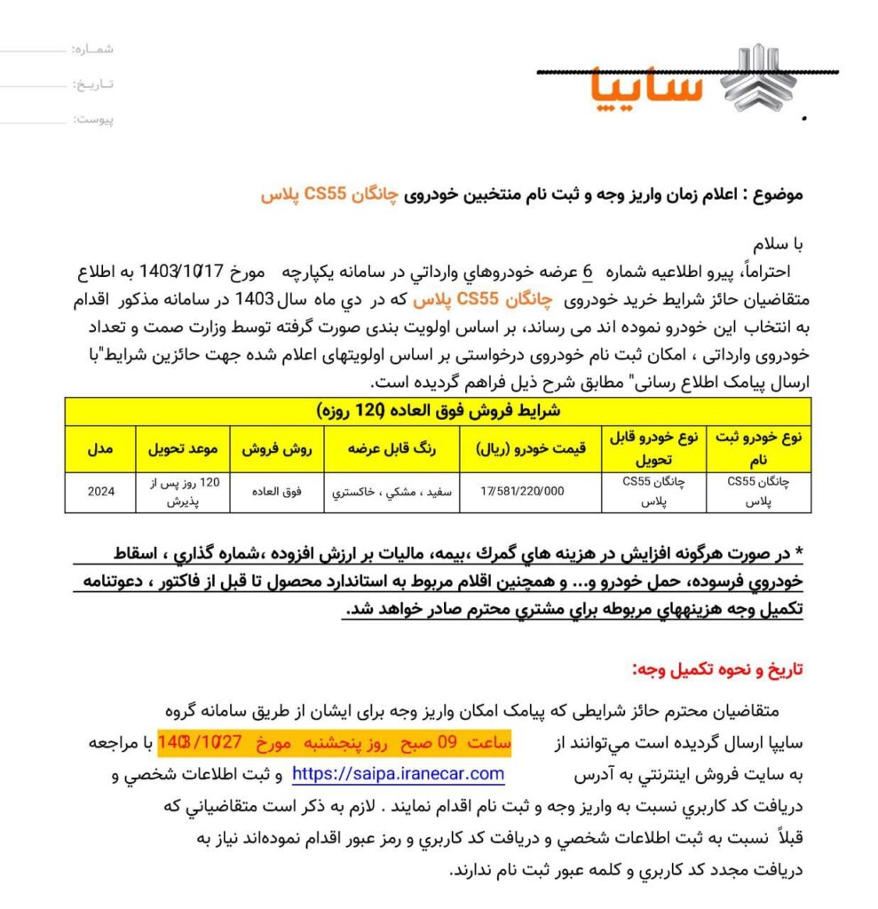 اعلام شرایط فروش چانگان SC۵۵ پلاس ویژه سامانه خودروهای وارداتی