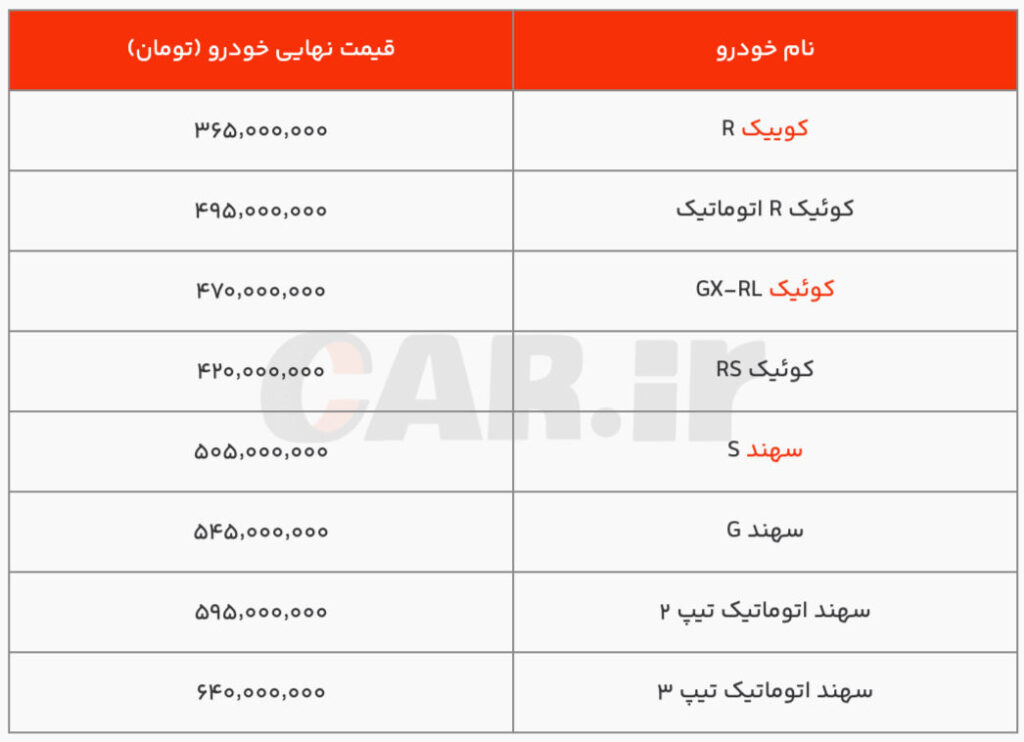 بر اساس گزارش های بازار، این افزایش قیمت شامل انواع خودروهای خانواده کوییک یعنی کوییک آر، کوییک آر اتوماتیک، کوئیک جی ایکس آر ال، کوییک آر تیپ اس استاندارد 85 و همچنین خانواده سهند شامل سهند اس، سهند جی، تیپ سهند اتوماتیک می شود. 2 و سهند اتوماتیک تیپ 3. می شوند در این بخشنامه […]