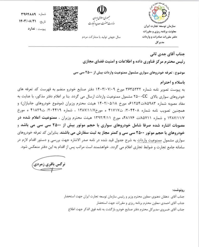 به گزارش بازار، سازمان توسعه تجارت ایران اعلام کرد بر اساس مصوبات هیات وزیران، واردات خودروهای سواری با حجم موتور بیش از 2500 سی سی همچنان ممنوع است. خودروهای با حجم موتور 2500 سی سی و کمتر مجاز به ثبت سفارش می باشند. لیست برخی از کدهای تعرفه مشمول این ممنوعیت به شرح زیر است: […]